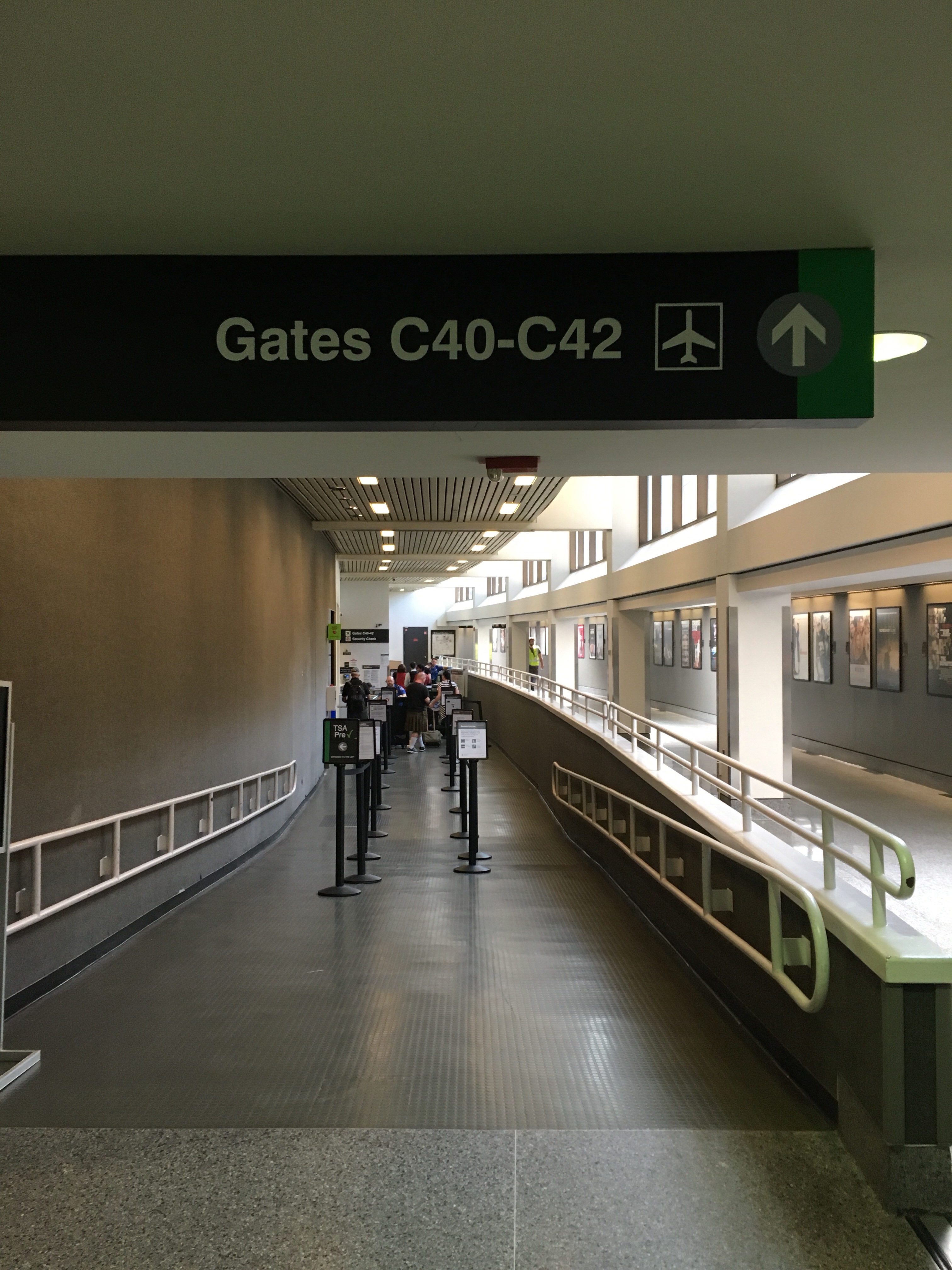 Gates C40, 41, and 42 have their own security line. They lie unconnected to the rest of the airport. Ostracized from the C terminal’s 39 other gates and services, gate C41 has exactly one restroom, a small cart selling $9.00 Aquifina, and insufficient fire code capacity to accommodate standing room for a full flight. I hate flying Alaska Airlines out of Boston.
